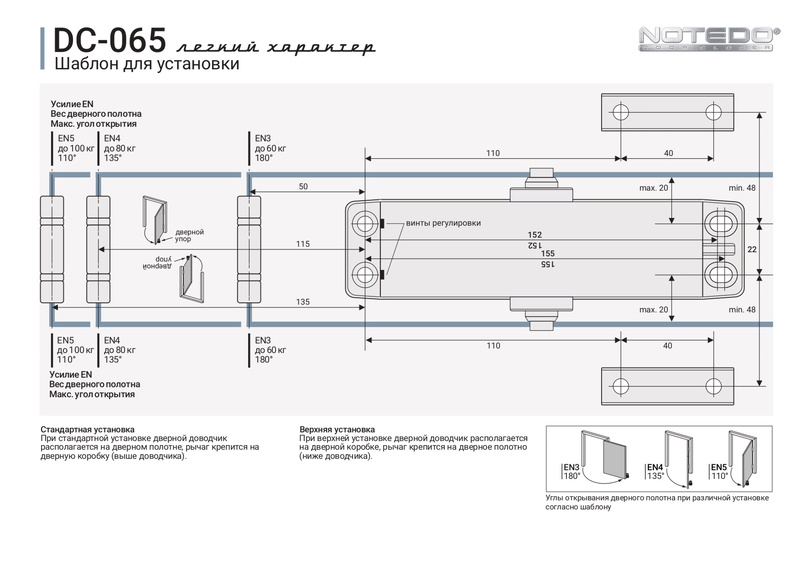 Дверной доводчик NOTEDO DC-065 со складным рычагом для дверей весом до 100 кг и шириной дверного полотна до 1250 мм. Усилие EN3-EN5 по стандарту EN 1154. Посадочные размеры 152-155x22 мм. Температурный режим от -40 °C до +60 °C. Плавное регулирование скоростей "закрывания" и "доводки". Максимальный угол открывания двери составляет 180°. Количество рабочих циклов составляет не менее 500 000 циклов открывания-закрывания. Габариты корпуса доводчика 172x43x63мм